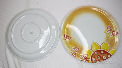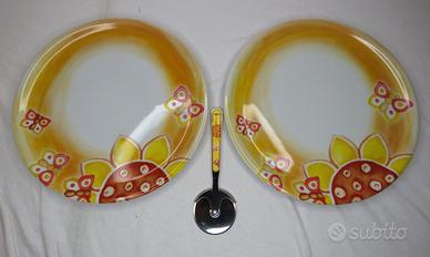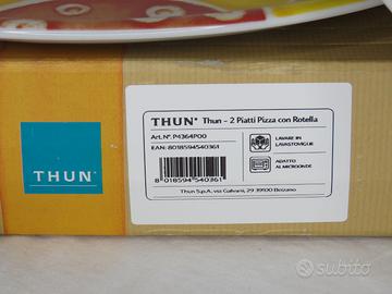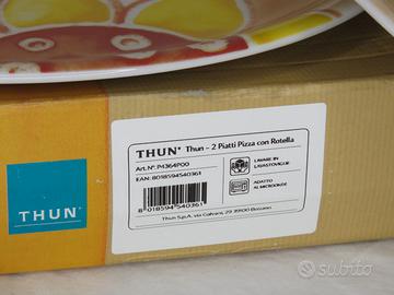 Materiale Porcellana decorata Misure piatti Diametro piatto 31 cm, Altezza bordo circa 2 cm, Spessore medio circa 4 mm, Peso indicativo di un piatto circa 700 – 750 g Misure rotella tagliapizza Lunghezza totale circa 18 cm Diametro lama circa 6,5 cm THUN propone un set pensato per trasformare un semplice momento a tavola in un piccolo rituale di convivialità. La confezione con due piatti pizza e rotella unisce funzionalità e stile in un oggetto perfetto per chi ama condividere il piacere della pizza fatta in casa o servita con cura. I piatti sono decorati nello stile inconfondibile THUN, con motivi delicati e tonalità calde che richiamano l’atmosfera accogliente della cucina italiana. Il set include due ampi piatti ideali per servire pizza, focacce o torte salate, accompagnati da una pratica rotella tagliapizza che consente di porzionare con facilità. Il design è studiato per un utilizzo quotidiano ma anche per rendere la tavola più elegante durante cene informali con amici o in famiglia. Grazie ai materiali resistenti e alla qualità produttiva THUN, i piatti sono adatti sia alla lavastoviglie sia al microonde, rendendo questo set estremamente pratico nella gestione quotidiana della cucina.