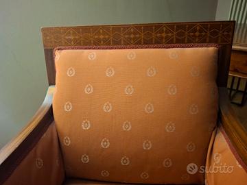 Sono 2 pezzi identici ed originali dell' inizio '800. Sono in noce con motivo ad intarsio sullo schienale e sui lati frontali. La struttura e rivestimento sono integri ed in perfetto stato di conservazione. Non necessitano di alcun restauro o trattamento. Adatti ad arredare salotto, camera da letto e angolo scrivania.