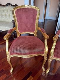 Coppia di eleganti poltroncine in stile barocco veneziano, realizzate con struttura in legno dorato e decori scolpiti.