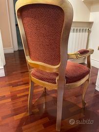 Le gambe anteriori sono arcuate (a cabriole), con intagli floreali in rilievo. I braccioli sono anch'essi rivestiti in tessuto e arricchiti da volute scolpite.