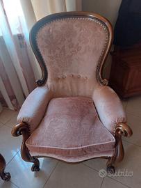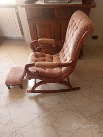 2 poltrone in tessuto damascato con cuscino in vera piuma d'oca. 1 sedia a dondolo con sgabellino sempre in tessuto damascato