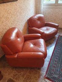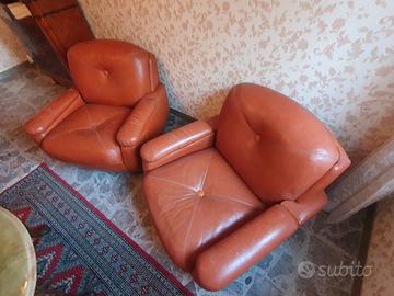 2 poltrone in pelle su ruote (4 ruote) design anni '70 in discrete condizioni, usate pochissimo, con segni del tempo trascorso sulla pelle, misure 88x90px76h cm. Ritiro in loco.
