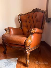 2 poltrone in stile classico/barocco, ispirazione Luigi XV–XVI. Telaio in legno massello intagliato Materiale: pelle Colore: marrone