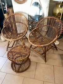 Due poltroncine in vimini più tavolinetto pouf anni 50 vintage, originale. Buone condiziini. 350 euro si trovano a Roma