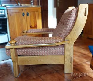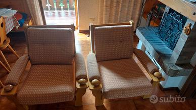 Vendo coppa di poltrone in pieno stile nordico/scandinavo, caratterizzate da una struttura robusta e artigianale in legno massello. Seduta ampia, cuscini originali. Strutture in ottime condizioni, legno ben conservato. Imbottitura ancora comoda. Larghezza 92 cm, Profondità 90 cm, Altezza 80 cm. Coppia Poltrone € 110. Vendibili anche separatamente € 55 a poltrona.