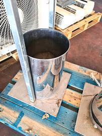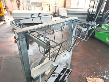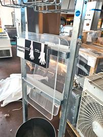 2 porta guanti e sacchetti in inox usati, si tratta di due strutture verticali in acciaio inossidabile utilizzate nei reparti ortofrutta dei supermercati per esporre guanti monouso e sacchetti di plastica, completi di cestino.