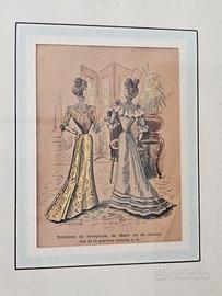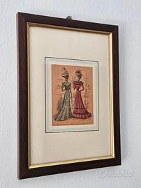 Due Quadretti vintage raffiguranti due dame voltate di schiena che parlano tra di loro. Cornice in legno, passepartout in cartoncino.