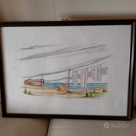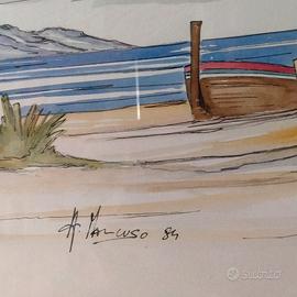 vendo con formula visto e piaciuto due quadri della mia collezione risalenti agli anni 80 dipinti ad acquerello raffiguranti una scena di spiaggia serena, con una barca in legno e vegetazione verde. La firma dell' autore indica che l’opera è stata creata nel 1984.