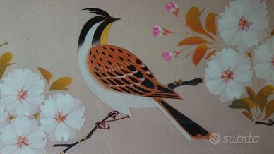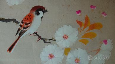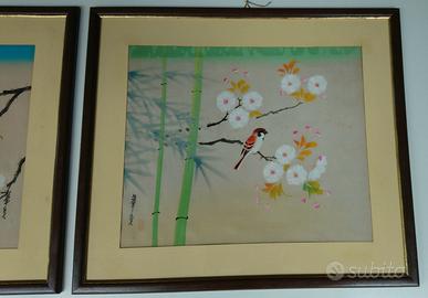 Vendo 2 quadri originali arte Giapponese tema uccelli, molto belli, dipinti su pregiato tessuto in seta, acquistati in famoso negozio d'arte in Liguria, Batifoglio, Oneglia (IM), come si vede dall'adesivo sulle foto del retro dei quadri, alla fine degli anni '60 o inizi anni '70.