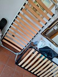 Reti in doghe e 2 materassi singoli. uno dei due materassi è macchiato su un lato.