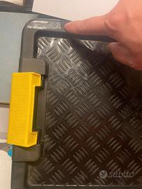 • nere con piccoli manici gialli, sollevabili che fungono da chiusura