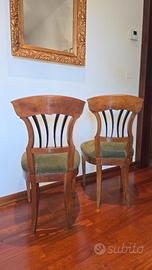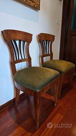 Magnifica coppia di sedie in legno massello autentiche, risalenti all'epoca Biedermeier/Tardo Impero (Prima metà del XIX secolo). Questi pezzi, tramandati per tre generazioni, sono caratterizzati da una linea elegante e da una superba manifattura artigianale.