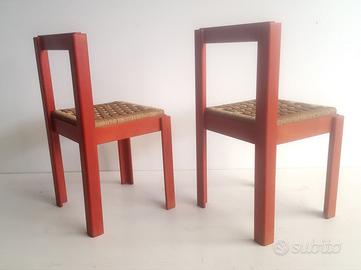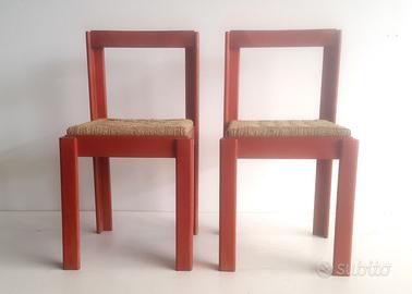 2 sedie in legno tinto paduka con seduta impagliata a mano prodotte dall’azienda Alberticasador Limbiate Milano, produttore artigianale di cucine con elevato valore qualitativo e formale. La sedia unisce elementi tradizionali a forme di design: gambe con profilo a “elle”, spalliera di appoggio anatomica, leggermente sagomata. Le 2 sedie impagliate non sono mai state utilizzate, sedile praticamente intonso, struttura in legno con qualche lieve mancanza di colore.