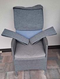 2 sedie/poltroncine reclinabili in rattan intrecciato color grigio, dotate di braccioli e piedini.
