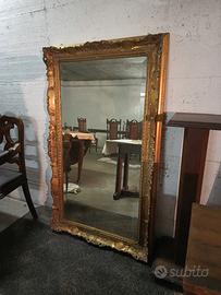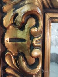 Cornice: in legno massello, intagliata a mano, finitura in foglia oro con ricci barocchi scolpiti a rilievo.
