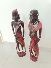 Bellissime statuette in legno intagliato a mano, raffiguranti due figure Masai. Sono dipinte con colori vivaci e presentano dettagli intricati.