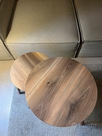 Vendo due tavolini da salotto, di diversa dimensione, complementari (53x49cm e 39x44cm). In legno di una tonalità molto elegante. Il tavolino grande ha una riparazione un po’ spartana su una gamba, ma la riparazione è invisibile e il tavolo super stabile!