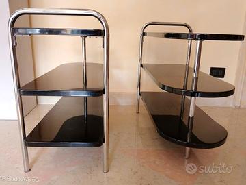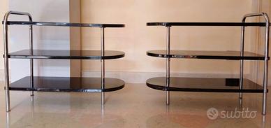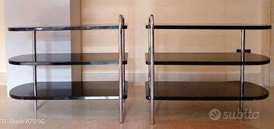 Una coppia di rari tavolini, o comodini a giorno, dal gusto puramente art decò americano, in acciaio con legno laccato nero lucido. Oggetti pratici, ideali per ogni ambiente e affascinante, acquistati negli USA negli anni 1980.