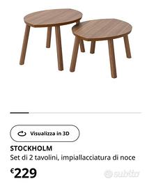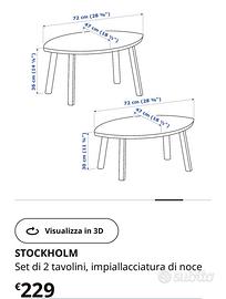 Coppia tavolini Stockholm di Ikea. Impiallacciatura di noce. Misure e prezzo originale in foto. In ottime condizioni, solo piccolo graffio superficiale su uno dei due, appena visibile. Ritiro a Pavia. Eventualmente ho ancora imballaggio originale.
