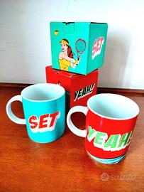 Due tazze mug colorate a tema Pop Art altezza 10 cm. Porcellana adatta a microonde. Lavabile in lavastoviglie. Fabbricato in Europa, no cinesate. Nuove con scatola originale. Come da negozio Vendute in coppia. Il prezzo dell'annuncio si intende totale Scambio a mano a Roma o spedizione con Tuttosubito colazione latte caffè tè tisana camomilla infuso oasi bevande fredde calde cappuccino cucina arredo stoviglie tazza tigre idea regalo natale verde acqua rosso bianco tennis surf set yeah coffee tea