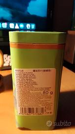 2 confezioni da 50 gr ciascuna, ancora sigillate e in contenitore di latta da regalo.