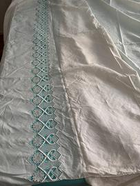 2 tende di lino bianco con ricamo geometrico/floreale e ricamo a giorno sulla fascia inferiore