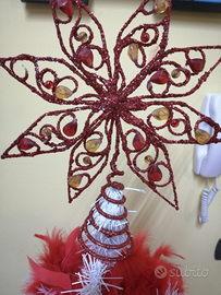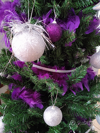 2 tipi di decorazione: - Palline rosse e dorate, boa rosso, stella rossa. - Palline viola, trasparenti e bianche, boa viola, stella viola. Luci gialle incluse Regalo altri tipi di addobbi. Usato, ben tenuto. Albero non compreso