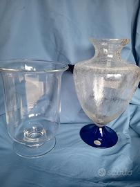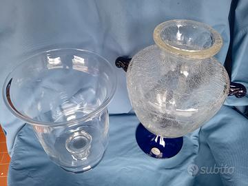 N. 2 vasi in vetro misura gradevole vaso ad anfora in vetro murano lavorazione effetto ghiaccio e con finiture in vetro blu misura altezza cm. 36 a larghezza max cm. 30. Vaso capiente in vetro trasparente misura altezza cm. 28 e larghezza max cm. 21. vasi venduti in coppia a 60 euro singolarmente 40 euro vaso murano effetto ghiaccio e 30 vaso vetro trasparente vasi in ottime condizioni come da foto allegate non effettuo spedizione solo ritiro a mano