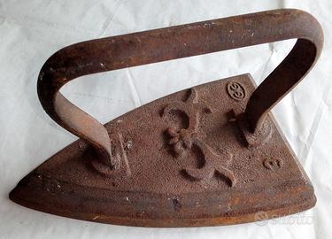 2 Ferri da stiro in ferro pieno, lunghezza 15 cm circa, sono quelli che si scaldavano nella brace e poi si stirava o venivano usati caldi e pesanti per mettere in piega dei dettagli dell'abito, ideali per arredo vintage o per taverna, finitura grezza e allegorie in rilievo
