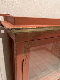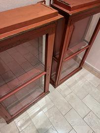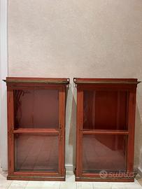 2 vetrinette da muro di metà 800. Create per uso in cappella privata, sono decorate con Chinoiserie. Sono in buone condizioni, con vetri originali, a parte la sostituzione di un vetro moderno su un lato di entrambe. Provengono da una villa nel Chianti.