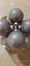 Bellissime grandi palline in vetro color grigio perla, 24 pezzi. Diametro 8 centimetri. Perfette, pari al nuovo, in confezione originale. Vendo a euro 25,00 solo ritiro mano, non spedisco. Dispongo anche di altre decorazioni da abbinare vendute a parte.