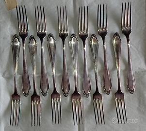 24 posate in alpacca versilbert, 12 forchette e 12 cucchiai da 21 cm circa di lunghezza tutte integre nessuna abrasione ne rottura, sono solo da lucidare per bene, sono rimaste in un cassetto per molti anni inutilizzate, venivano impiegate per addobbare la tavola o impreziosire la vetrinetta, ideali per arredo vintage o da esposizione. vendute tutte insieme.