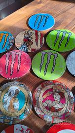 Lotto di 29 sottobicchieri rotondi con diverse grafiche. Ricavati da lattine. Il sotto è in materiale mdf. Diametro cm 10 circa. Un piccolo difetto visibile in foto