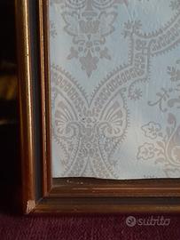 È tutto originale, è stato rinnovato solo il pannello di fondo foderato con una carta stile retrò di alta qualità, che riproduce fedelmente un motivo classico del XIX secolo con eleganti decori damaschi, concepito per un duplice utilizzo: può fungere da elegante passepartout frontale per incorniciare al meglio stampe e foto, oppure, semplicemente capovolgendolo, diventa il classico pannello di chiusura. Il fissaggio è saldo e discreto, garantito dai chiodini originali inclusi che sono stati conservati.