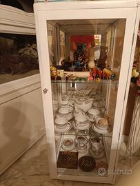 Vendo elegante vetrinetta bianca in legno con ante e ripiani in vetro, ideale per esporre collezioni, servizi da tè o oggetti decorativi.