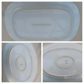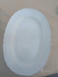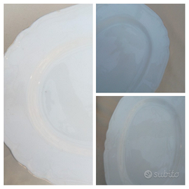 Due vassoi in porcellana bianca anni '70,di cui uno dei due Richard Ginori. Sono piatti da portata, tipo per contorni o per secondi oppure si possono usare come vassoi portacaramelle sopra un mobile. Non hanno rotture. Entrambi sono anni' 70:il Richard Ginori, ovale, è marcato sul retro, come da fotografia (il marchio Italy è appunto anni '70);l'altro, più squadrato, non è marcato, na è coevo al Ginori. Bordo dorato del Ginori scolorito, come da fotografia :normale vista l' età. Le misure:Ginori:24,5 centimetri larghezza x34, 5 centimetri lunghezza ;quello non marcato:23,5 centimetri larghezzax37, 5 centimetri lunghezza. Senza confezione originale