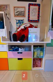 2.tavolo/fasciatoio con ripiano regolabile in altezza a seconda dell'uso L90xH103xP80, 3.cassettiera L60xH129xP51,