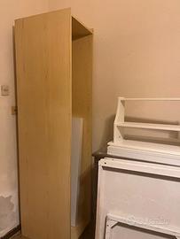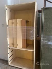 - armadio in legno chiaro, 3 ante e 4 cassetti (L 140 x P 55 x H 200);