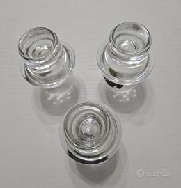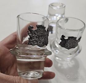 Vendo tre bicchierini da liquore in vetro vintage. Stemma in peltro applicato raffigurante il motto "labor omnia vincit". Sono bicchierini pesanti con base spessa e anello in vetro per facilitare la presa. Condizioni visibili in foto