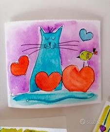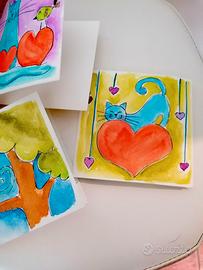 3 biglietti d'auguri dipinti a mano tema gatto