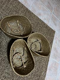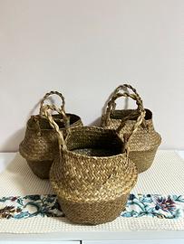 Set di 3 cestini portaoggetti in rattan intrecciato a mano in stile bohémien con manici.