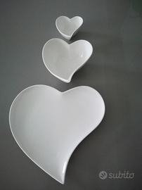 3 piatti in ceramica da usare come svuota tasche arredo o decoro in salotto o come ciotole a forma di cuore in ceramica bianca di diverse misure, da usare insieme o separatamente, uno dentro l altro o staccati, con aperitivi, pranzi o cene, con salsine, aperitivi, confetture, per un tocco originale, oppure in bagno per gessetti,saponi.Nuovi. Vendo per inutilizzo. Diverse dimensioni: il più piccolo lungo 4 cm, il medio 6 cm e il grande lungo 15 cm.