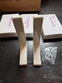 Vendo stock di 3 scatole di reggimensola dal design moderno e minimale, colore bianco lucido. Ogni scatola contiene una coppia di staffe, per un totale di 6 mensole supportate.