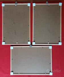 Tre cornici in legno laccato bordeaux, ganci per appenderle e feltrini sul retro per proteggere la parete. Misure 32 x 22 In perfette condizioni