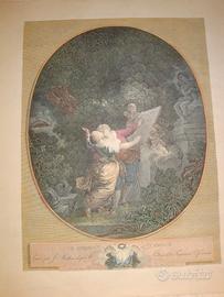 Sul lato inferiore, un cartiglio tridimensionale con uno stemma centrale contiene il titolo e - tra l'altro - i riferimenti al dipinto di Fragonard da cui è tratta l'incisione. In cornice semplice dorata anni '60.