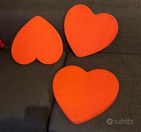3 Bellissimi cuscini piatti , imbottiti di sostenuta gommapiuma, color rosso fiamma , a forma di cuore