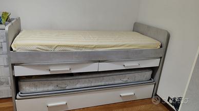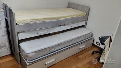 3 letti con 2 scrivanie e 2 cassetti incorporati. Scaletta inclusa.