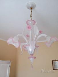 3 luci - Lampadario di murano in bianco seta e rosa Daisy.