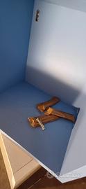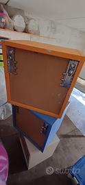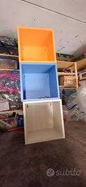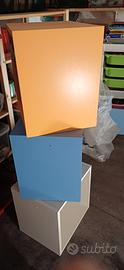 2 Cubotti porta oggetti color arancio ed azzurro impilabili o attaccabili al muro. Misure 45x45 Cubotto celeste leggermente graffiato all' interno.