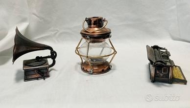 tre miniature: una lampada, un grammofono, una macchina da scrivere.